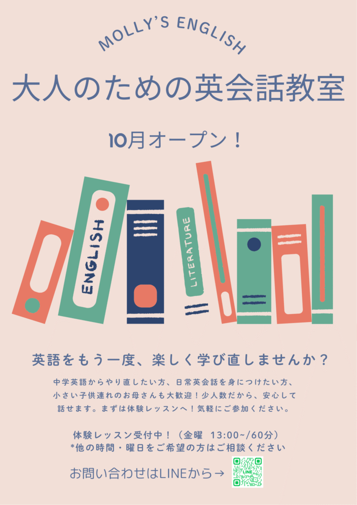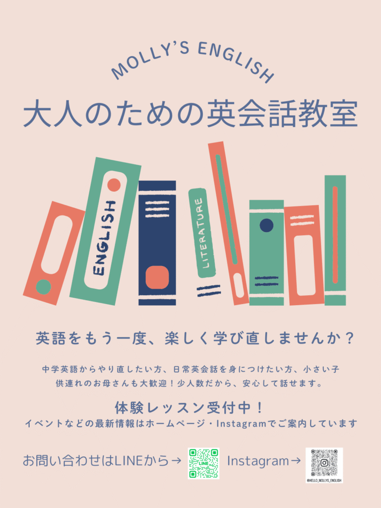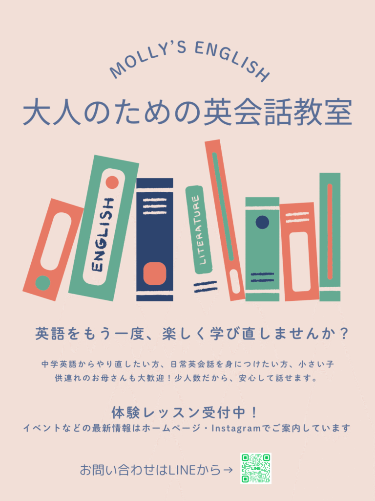 Molly’s Englishでは、ずっと英語を勉強していなくてまた始めたいと思っている方や、英語を使えるようになりたいと考えておられる方を対象にした、大人の少人数制英会話レッスンを開講します。初めての方にも安心してご参加いただけるようなクラスをご用意しておりますので是非一度体験レッスンにお越しください。また、小さなお子様連れのお母さんも大歓迎!キッズスペースもご用意しております。
